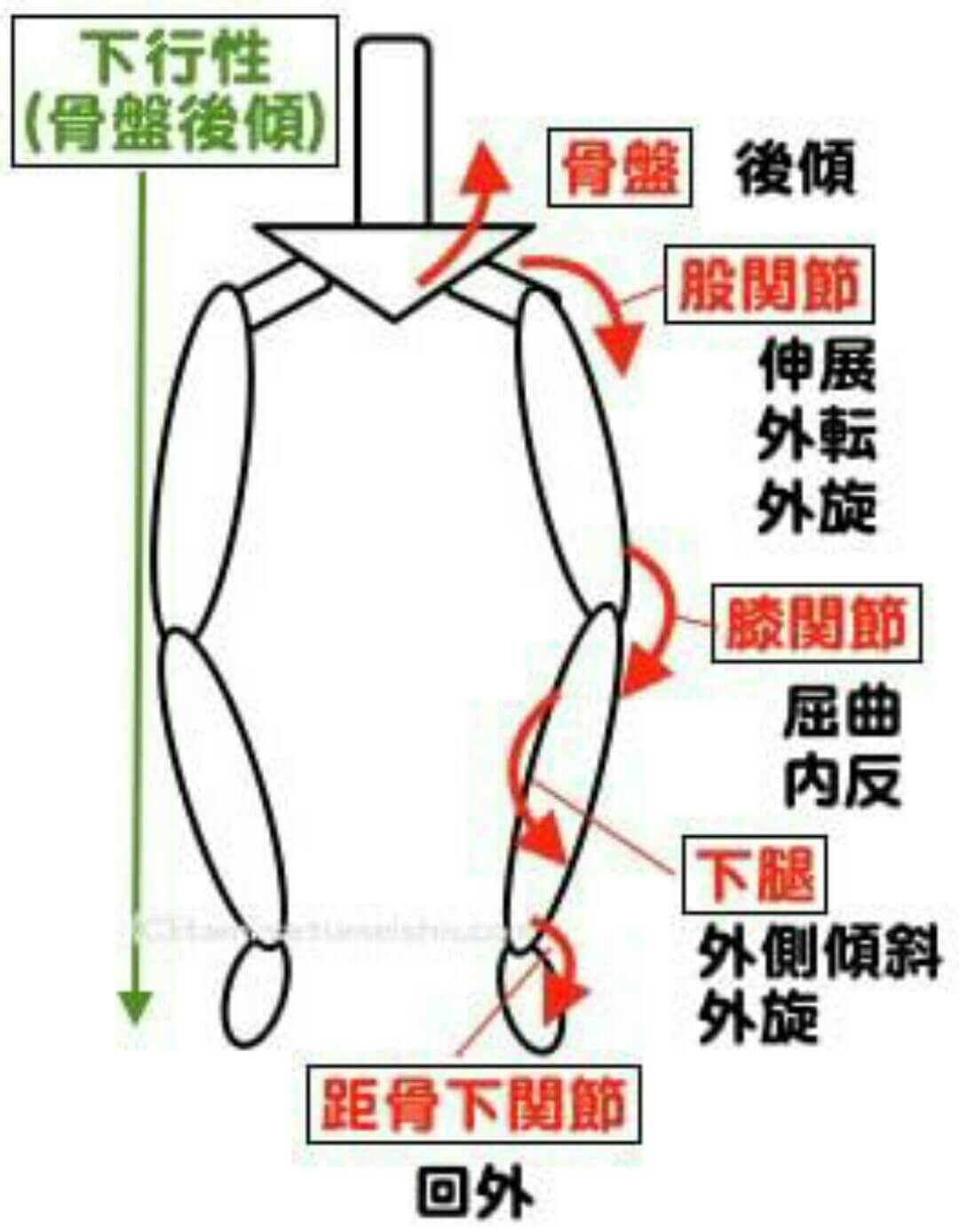 骨盤が後ろに倒れると運動の連鎖から太腿の骨は外旋し、それとともに脛の骨も外旋してしまいます。