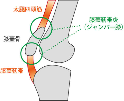 バスケットボールやバレーボールのようなジャンプをよく行うスポーツやサッカーのようにボールを蹴ったり、ダッシュをよくするスポーツでよく起こるオーバーユース(使い過ぎ)が原因のスポーツ障害です。