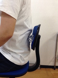 このような姿勢はつらいので、背もたれに近づいてペットボトルなんかを