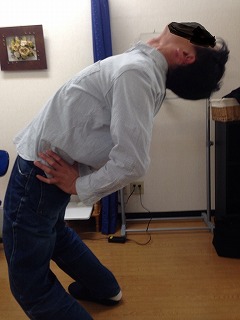 背中の猫背気味の所に動きを付けていって前傾気味の身体を解消。